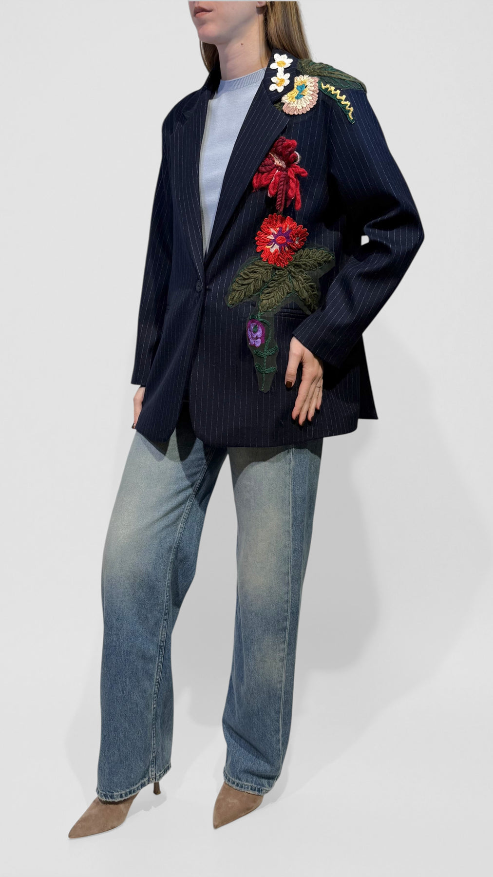 Tensione In - Blazer monopetto gessato con dettaglio fiori ricamati.