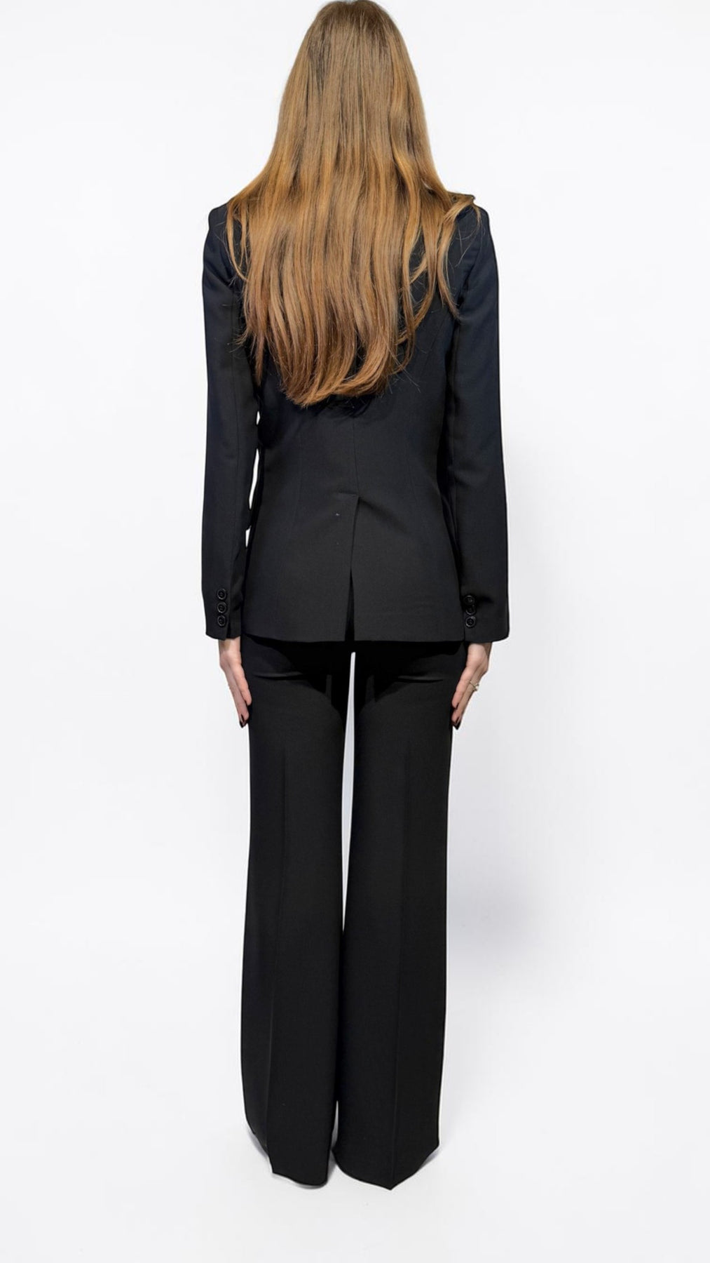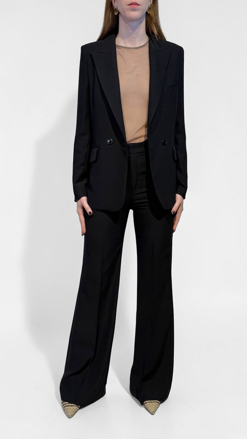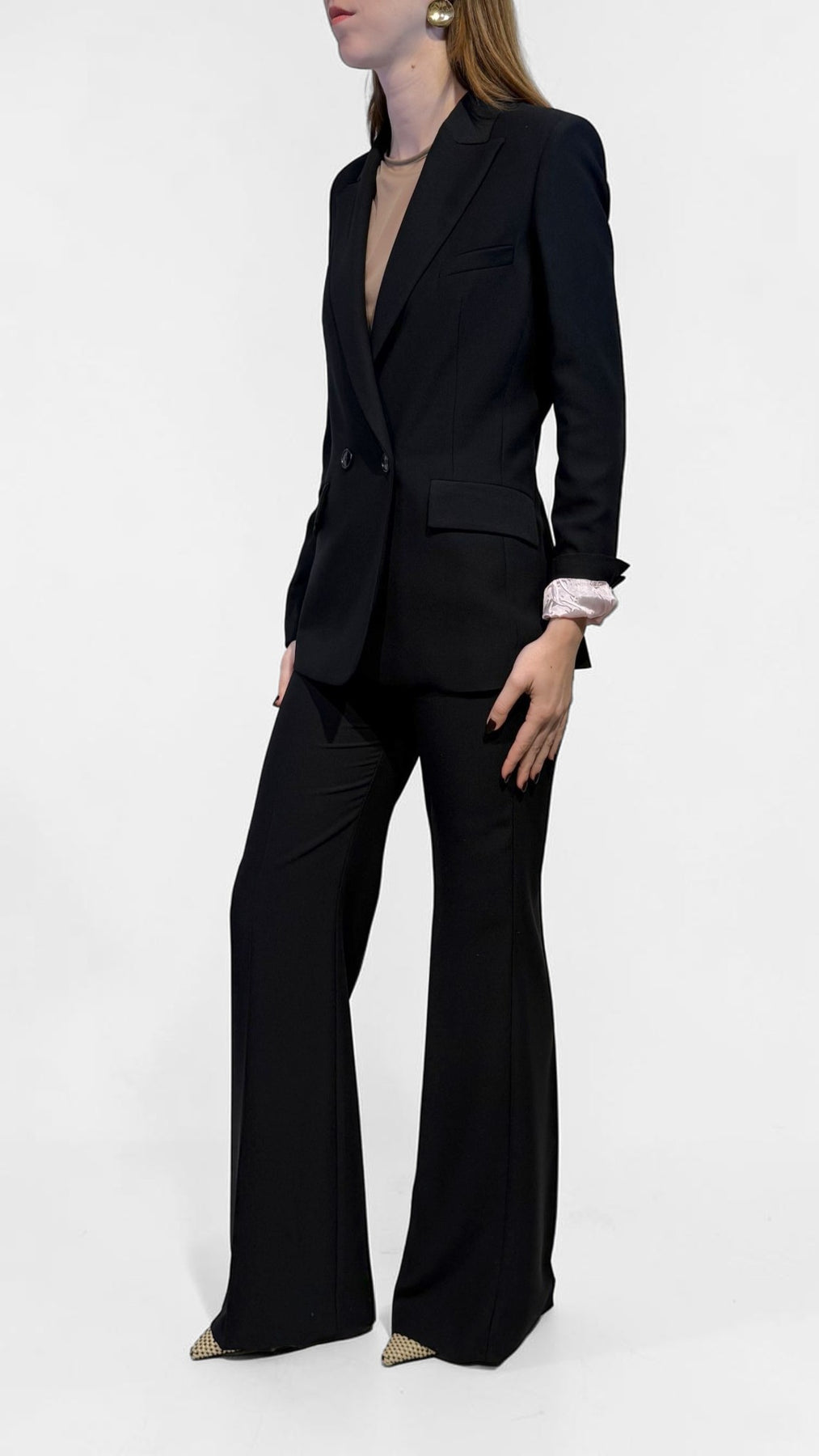 L'Armadio di LuLù - Completo giacca doppiopetto con revers a lancia, tasche a patta e pantalone flare vita alta con abbottonatura nascosta con gancio e zip.